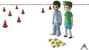 De røde og blå kegler fordeler I på et tilpas stort område. De gule ærteposer med bogstaver ligger samlet et andet sted.